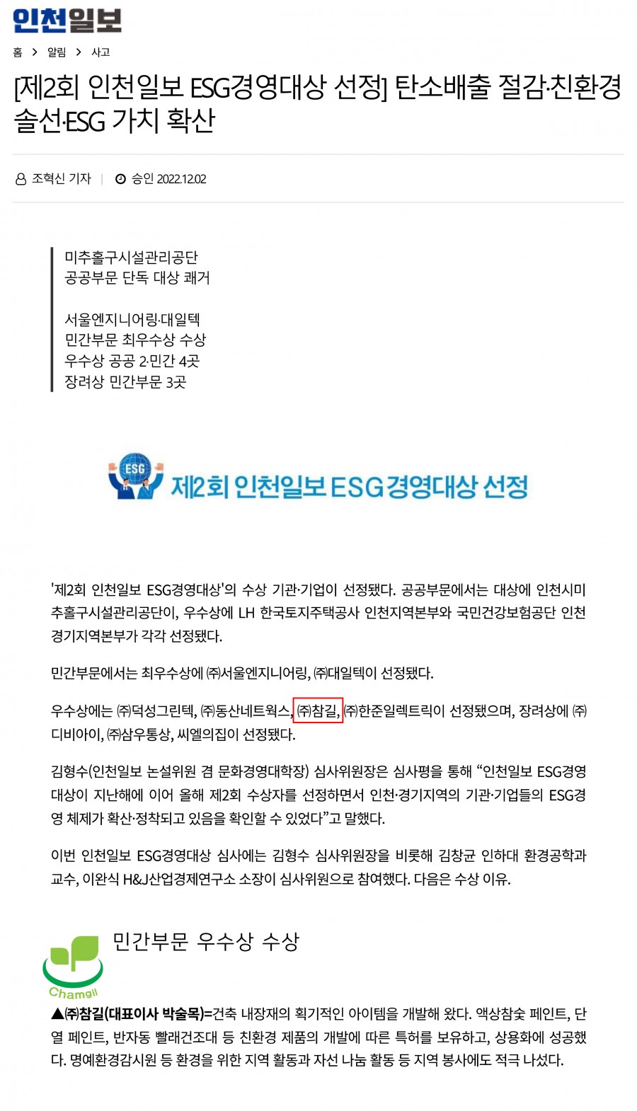 인천일보 제2회 ESG경영대상 민간부문 우수상 수상 페이지 정보 작성자 최고관리자 작성일22-12-07 15:08 조회28,859회 댓글0건 관련링크 본문 인천일보 제2회 ESG경영대상 민간부문 우수상 수상 댓글목록 등록된 댓글이 없습니다. 이전글 다음글 목록